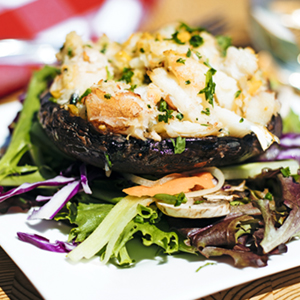 Lightly mix all ingredients together in a bowl. Divide in four and mound into each mushroom cap—do not press into the cap—then bake in a preheated 350°F (180°C) oven for 35- 40 minutes. Serve with a side salad.