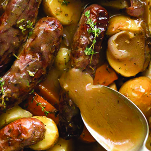 Once cooked, transfer sausages and potatoes to a serving platter and cover. Reduce the cooking liquid over high heat until 1 cup of liquid remains. Pour sauce over the potatoes and sausages. Garnish with parsley.