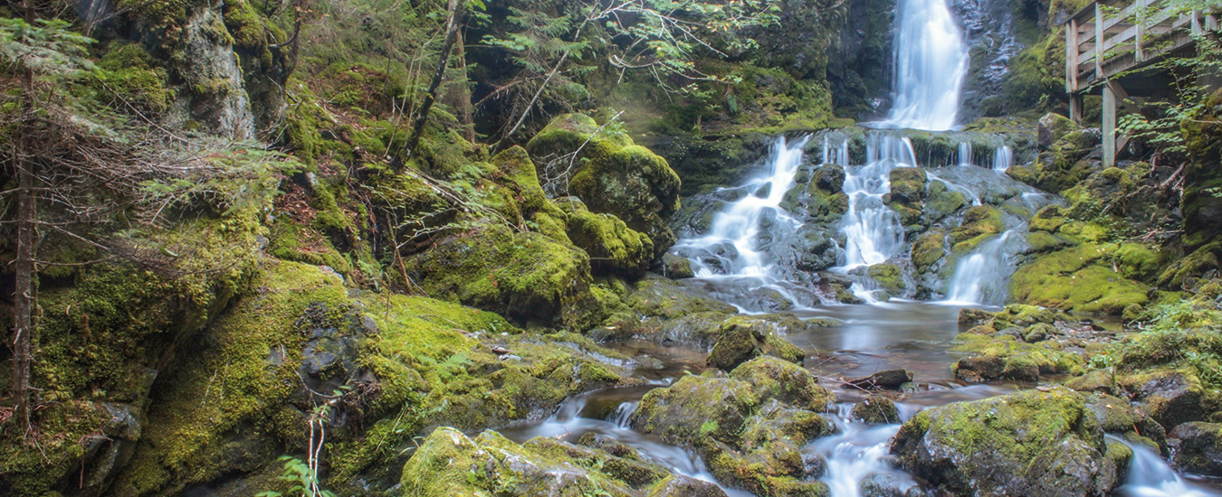 This is just one of a hundred or so waterfalls on Canada’s East Coast. From the thundering, high force in the centre of town in Grand Falls, N.B. to the long tumbles hidden deep in Nova Scotia’s Cape Breton Highlands, you’ll find waterfalls in many locations. Some are so massive, they are the sites of major hydroelectric stations. Others are higher than Niagara Falls. Fast flowing streams fling themselves from mountaintops in Newfoundland and pour over sudden drops in the vast landscape of Labrador. Some form when rivers slip over smooth stones into deep pools. Others bounce down bedrock ledges, slicing into half a dozen ribbons before tumbling away in white water rapids. Still others drop straight into the ocean.