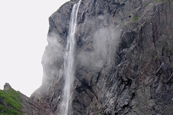 A thin stream shoots over a rock ledge high over the narrow end of Western Brook Pond. Launching from the plateau 343 metres above, the drop is so long, half the water sifts into a billion droplets, then into a mist that drifts away with the wind. The other half slaps against a wedge of mountain, then tumbles down a 45-degree slope to the lake. It’s no wonder some creative observer of this most unusual phenomenon came up with the colourful name Pissing Mare Falls.