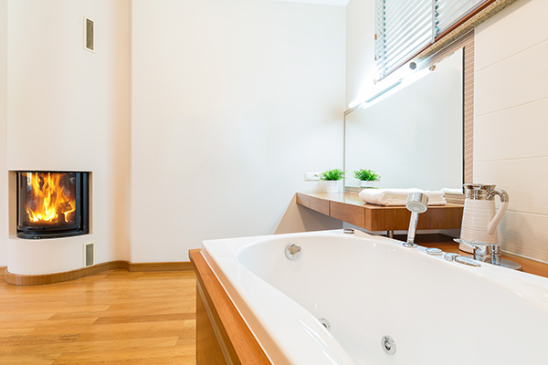 In the bathroom, a see-thru fireplace, as mentioned above, offers a beautiful look for both rooms, but there is also the option of freestanding stoves, or even a wall-mounted unit that can be gas, wood or electric. Having a fire in the same room as a large soaker tub is a luxurious touch for which many are now opting.