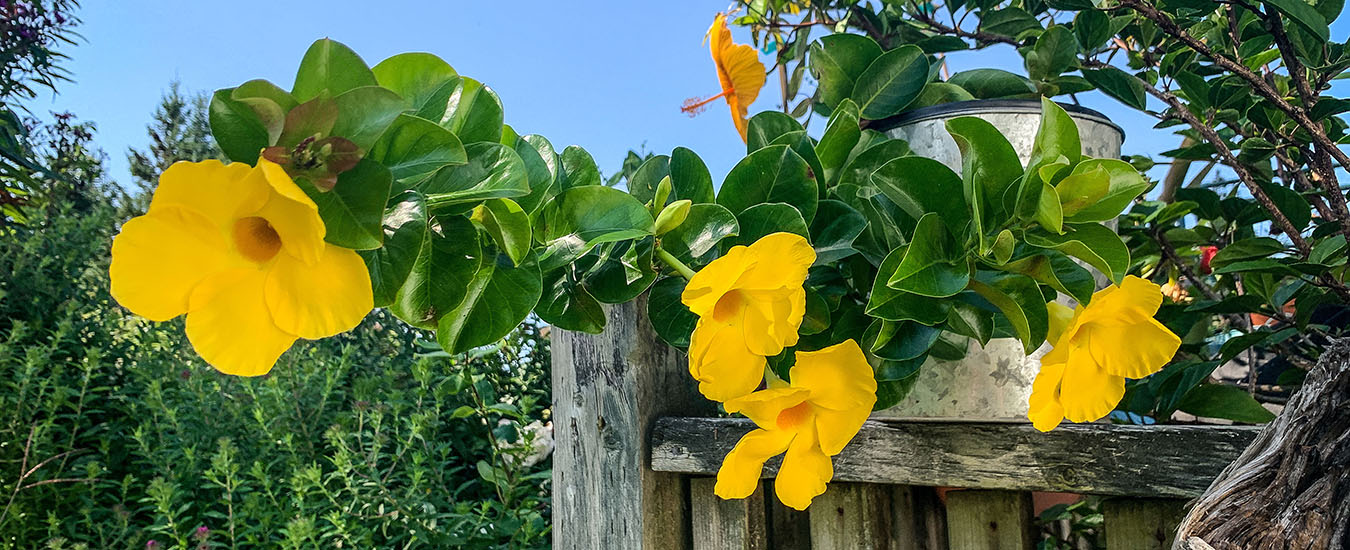 Header image: Flowering tropical such as hibiscus and dipladenia houseplants enjoy some time outside after the risk of frost is past in spring. Bring them in in mid-September before the first frost.