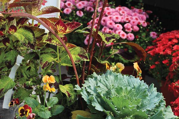 Late-season planters feature succulents, annuals such as pansies and flowering kale, and coleus for more colour; many hydrangeas are rebloomers right until frost.