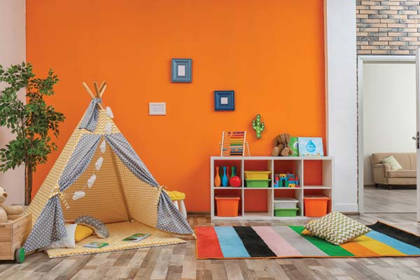 Book storage can be done with wall racks, and toys can be kept in bins and cubbies. And colourful foam floor tiles double nicely as a yoga mat for mom or dad in those times when you just need to savasana for a bit to keep your sanity.