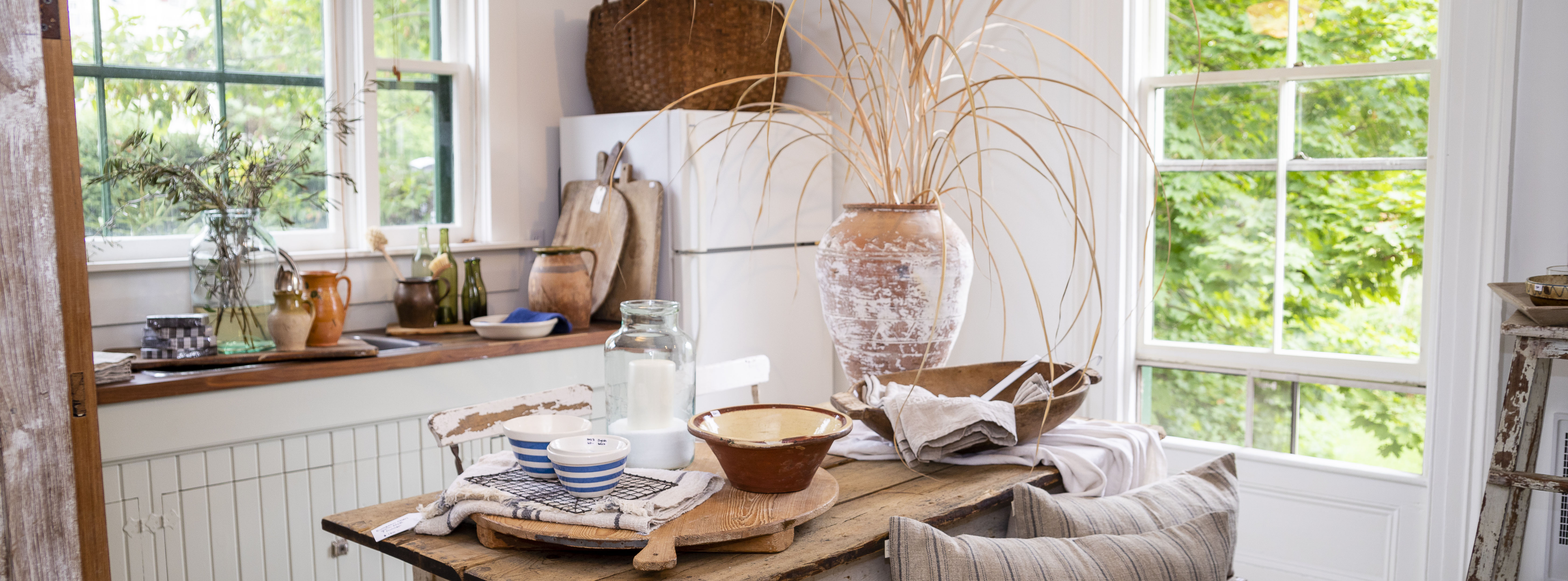 Sunlight spills into the kitchen and illuminates the butcher block counter tops and table layered with crocks and cutting boards. A large handwoven basket is perched on the top of the refrigerator; linen tea towels and napkins with gentle folds drape over the edge of a wooden dough bowl. It’s a perfectly curated kitchen for anyone with a love for the antique aesthetic. It’s a kitchen that tells a story. Not just for the objects of rarity that travelled far to a place on Nova Scotia’s south shore, but for its new human occupant who had his own journey and story to tell.
