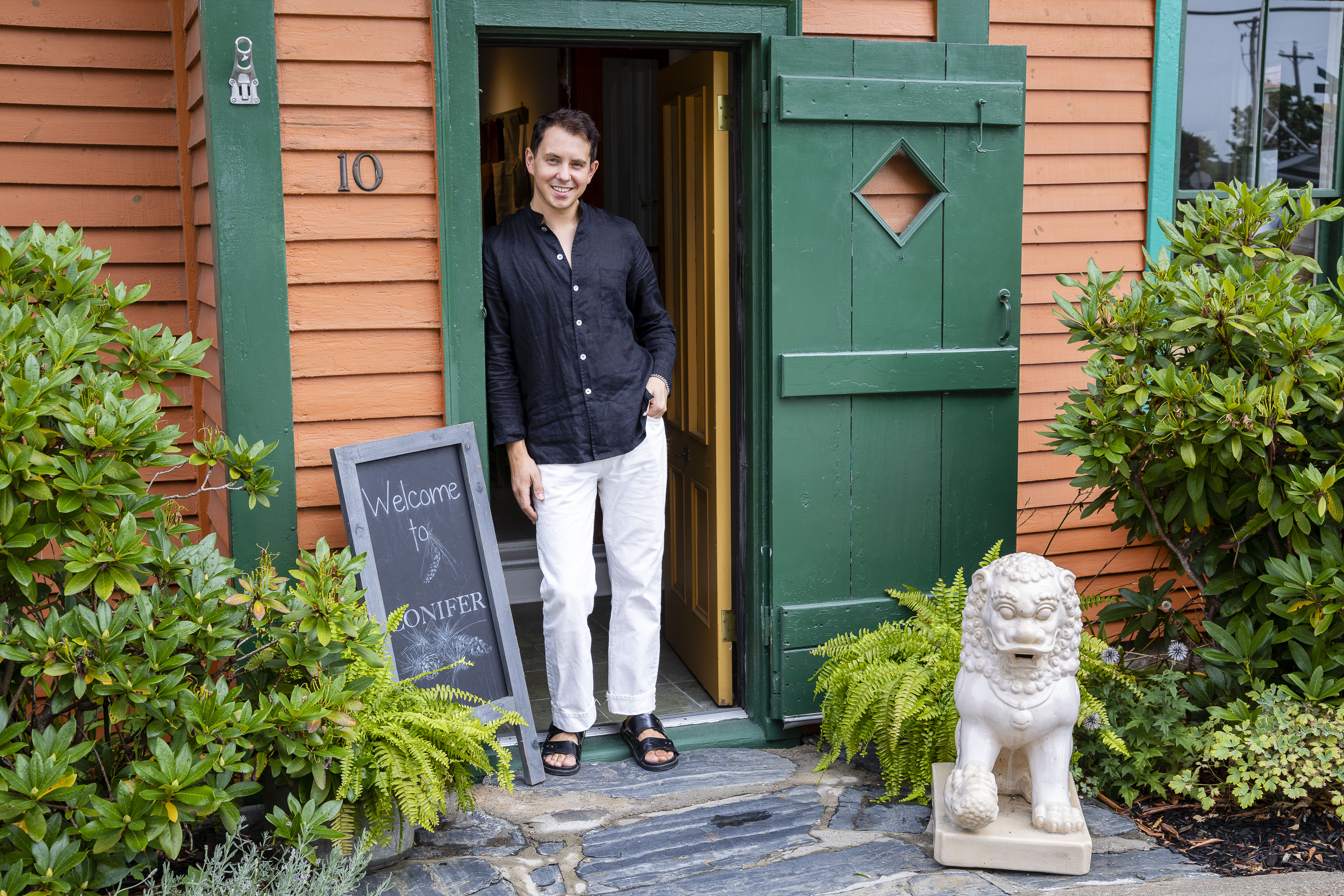 Brett Meech at the open door to Conifer, his first bricks and mortar shop, in Lunenburg.