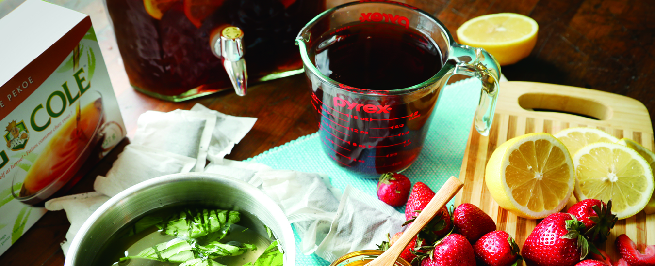 To make sweet tea place 3 cups of water along with baking soda in a saucepan, and bring to a boil. Add King Cole tea bags and let steep for 8 to 10 minutes. Remove bags and add remaining water. Stir in simple syrup and refrigerate for at least an hour.