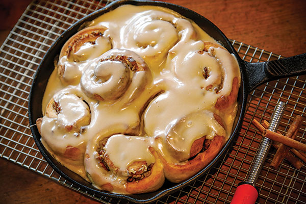 Place rested dough onto a lightly floured surface and roll into a 10 X 14 rectangle. Spread with butter and then sprinkle with maple sugar, cinnamon and pecans. Roll up dough from the long side and pinch the edge to seal. Cut into 10 portions and place in a greased cast iron skillet. Cover with a clean dish cloth and place in a warm area to rise for 1 hour or until doubled in size.
