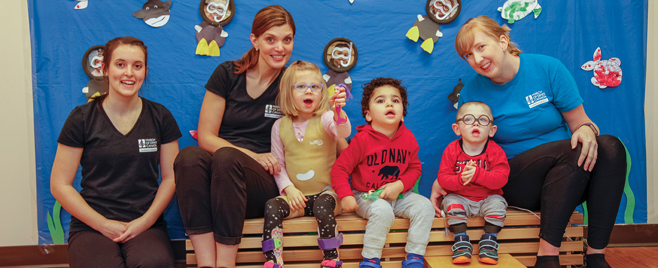 Header Caption: Left to right: Victoria, Beth, Nora, Yosef, Jackson and Brittany at one of the Conductive Education classes in Halifax, NS.